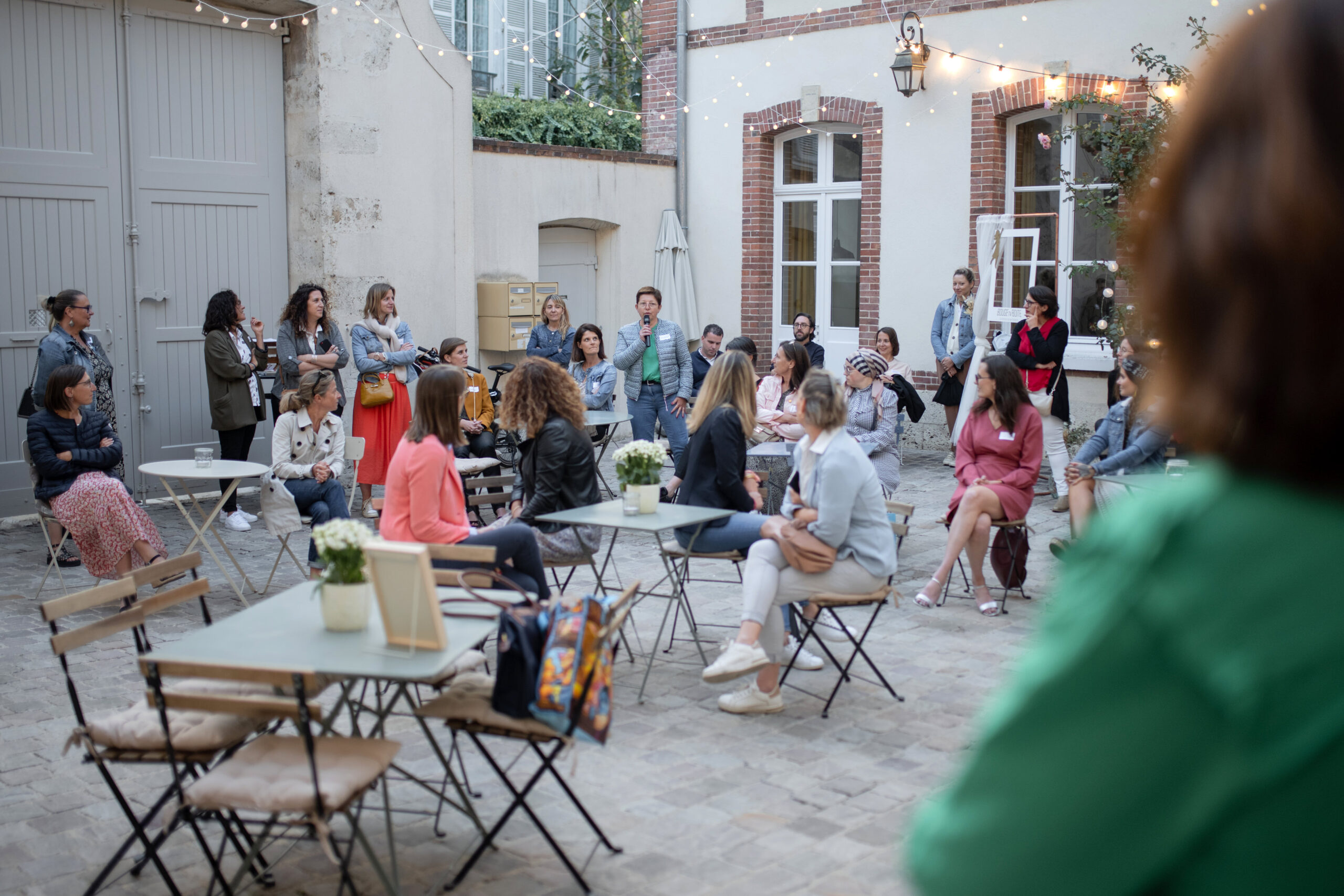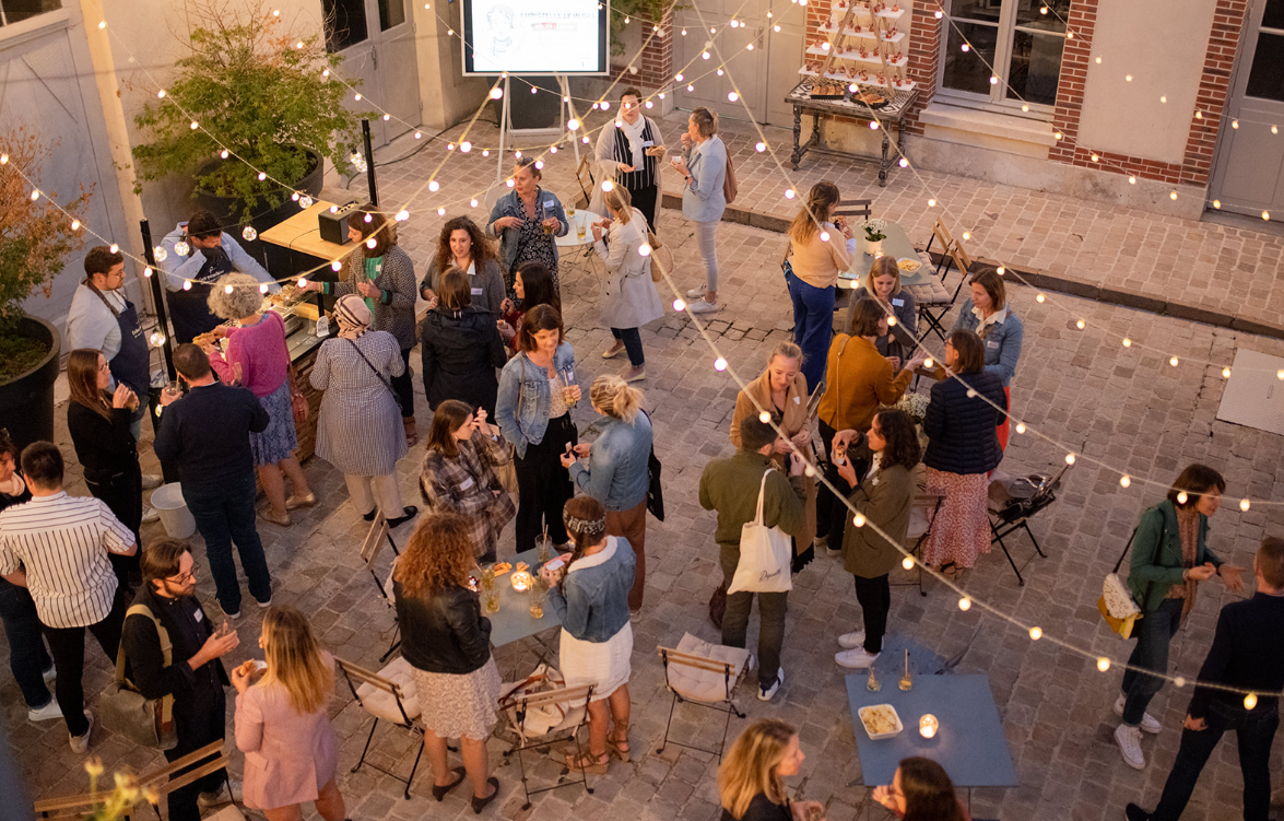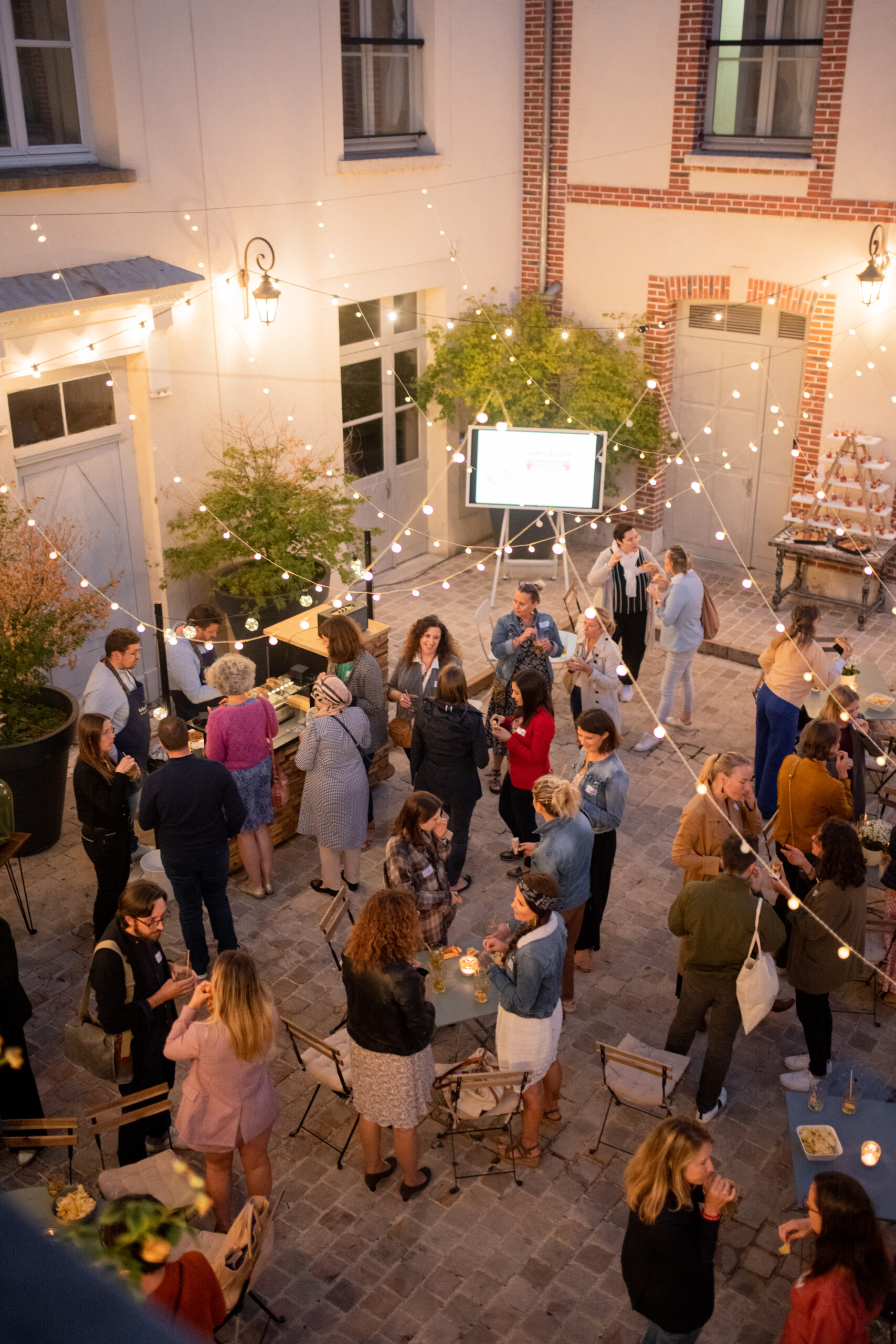 Des tables, un écran et des décorations peuvent être ajoutés dans la cour pour que votre événement prenne vie dans une ambiance chaleureuse et inspirante.